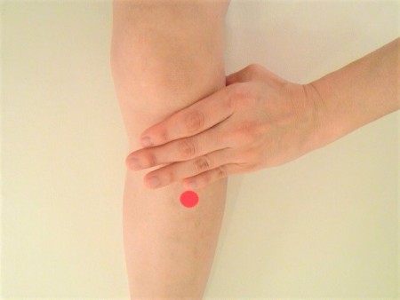 膝のお皿から自分の指4本下で、脛骨(すねの骨)の横の筋肉の真ん中