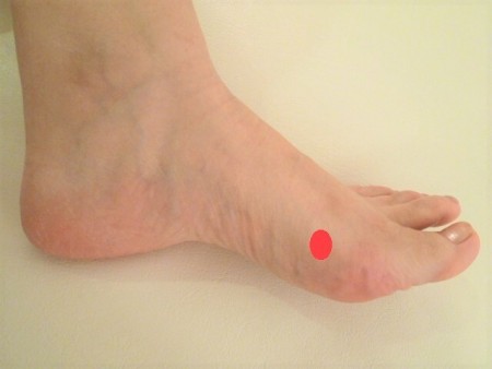 場所は、足の親指と人差し指の間でVの字に骨が合わさるところの凹みです。