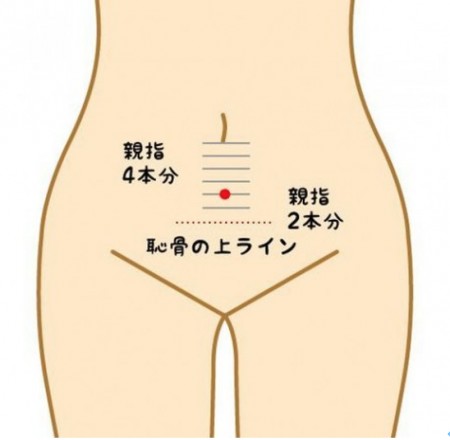 中極は、おヘソの下、指四本分(親指を横にして)下にあるツボです。冨田先生らのグループは、中極を使って夜間頻尿が軽減したことを報告しています。報告では、就寝前に3壮行っています。