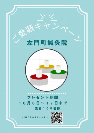 ・4月14日(月)~25日(金)春のキャンペーンとして、ご来院毎にセルフケア用のせんねん灸 レインボー1箱(10個)をプレゼントいたします。100箱限定、なくなり次第終了とさせていただきます。お早めにご予約下さい。