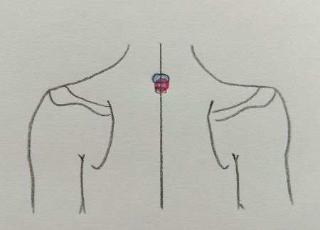 そこで、「大椎」のまわりを探ってみると、「大椎」より人さし指1本分程の両サイドにある筋肉がとても硬くなっていたので、今度はこの部分にお灸をすえました。1壮目でぴりっとした熱を感じたので、そこで終了。お灸をすえたところ、腫れている感じがだいぶなくなりました。しかし、30分後にはまた元の状態に戻りました。