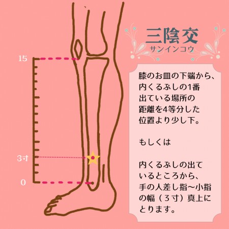 三陰交(さんいんこう):足首の内側。女性の不調や冷え、ホルモンバランスにおすすめです。