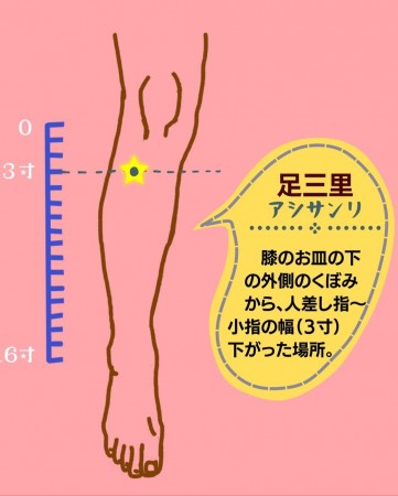 足三里(あしさんり):膝下。全身の気を整え、だるさや胃腸不調に有効です。