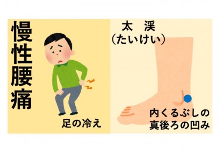慢性的に腰痛があったり、足が冷えて疲れがとれない場合は、「太渓」を刺激して「腎」の働きをよくし、全身の循環をよくしましょう。