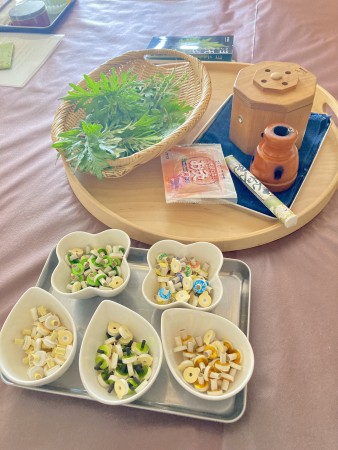 最初に新鮮なヨモギを見ていただきながら、お灸(もぐさ)はヨモギからできていること、お灸の歴史などお伝えしましたが