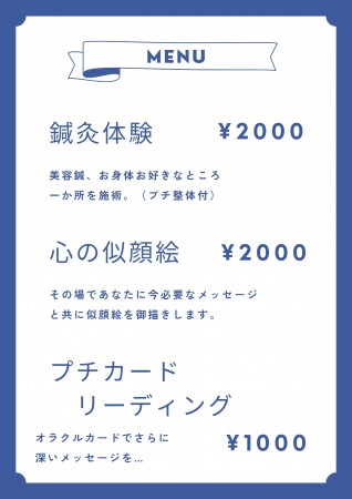 | 施術内容 | 鍼灸コース、美容鍼コース、整体、リフレクソロジー、アロマトリートメント、内観セッション、カードリーディング |