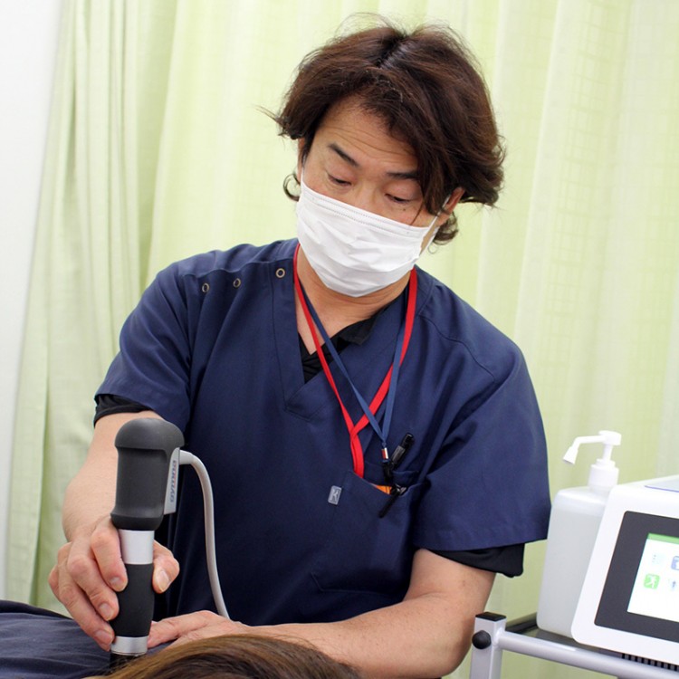 体外衝撃波 ショックマスターの施術風景1か所3分から5分ほどの施術で、なかなか治らなかったお痛みが緩和されます。