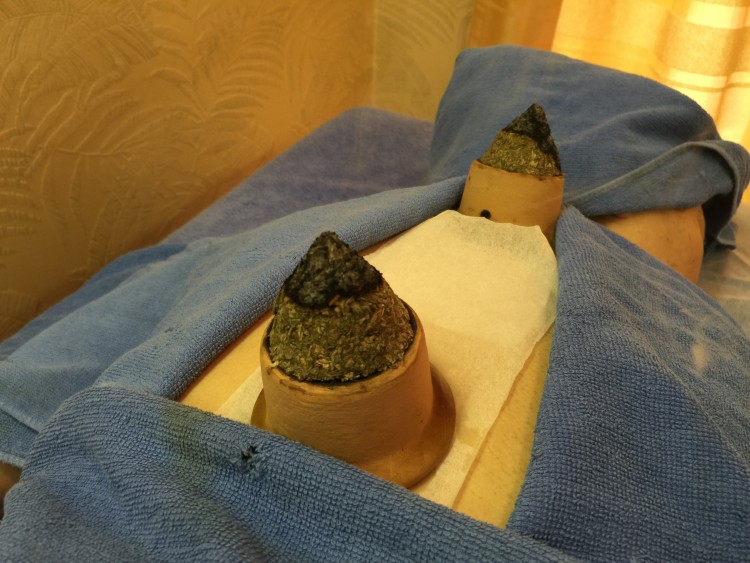 大きな三角温灸台座の上に艾を三角に固めた温灸をのせます。