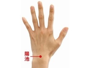 手の甲の側、手首のしわの真ん中、少しくぼみがあるところが「陽池」です。