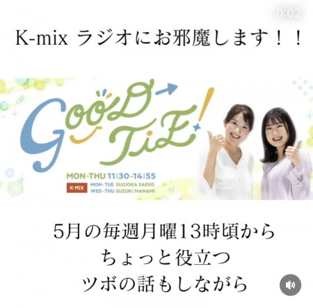 東京FM系 静岡 K-mixの番組 Good-tie(グッディー)の5月マンスリーゲストとして、毎週月曜午後1時からお話しさせていただいています。美人アナウンサー杉岡沙絵子さんとの女子トーク!?