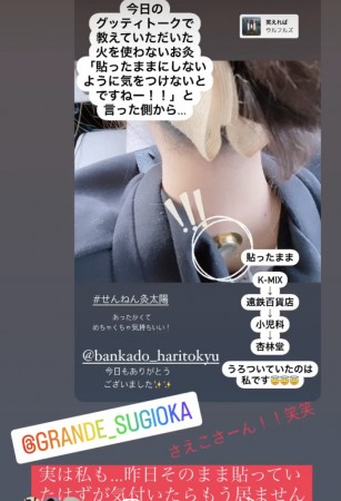 セルフケアとしてのおきゅうのお話や、大椎のツボ紹介の際にはせんねんきゅう太陽をカバンの中からゴソゴソ…と出して杉岡アナと一緒に貼り方のデモを!!!