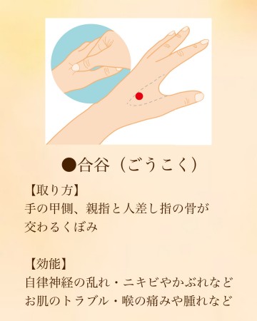 【取り方】手の甲側、親指と人差し指の骨が交わるくぼみです。