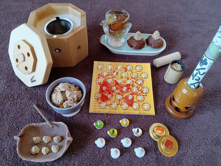くるみ灸菊花茶に漬け込んだくるみを目に乗せて、もぐさを燃やします。空洞の殻で蒸されるため、血液循環が促進され視界がクリアになり目がスッキリ!眼精疲労に効果的です。