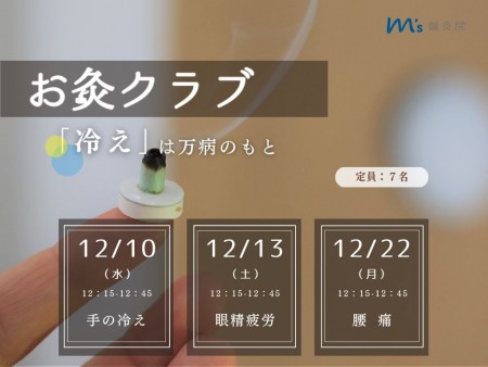お灸を使ったセルフケアが出来るよう、「正しいセルフ灸の使い方」や「症状に応じたツボ」を学び、実際にお灸を行います。手足のツボを用いるので男女問わず参加可能です。今回は「手の冷え」がテーマです。