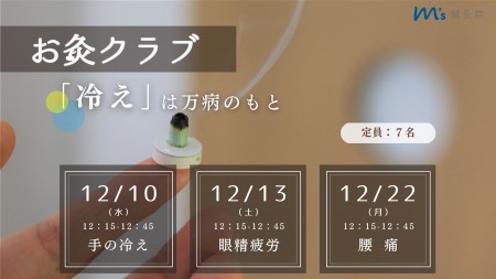 お灸を使ったセルフケアが出来るよう、「正しいセルフ灸の使い方」や「症状に応じたツボ」を学び、実際にお灸を行います。手足のツボを用いるので男女問わず参加可能です。今回は「腰痛」がテーマです。