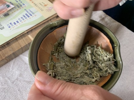 よもぎからすり鉢でごりごりよもぎを擦ってもぐさを作り、作ったもぐさで竹塩灸を体験していただきました。
