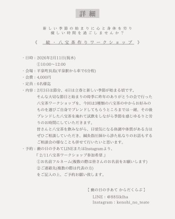 そんな節目、季節の変わり目に身体と心を労り、皆さんと楽しい時間にしたいと思いますので、気になる方は是非ご参加くださいね!