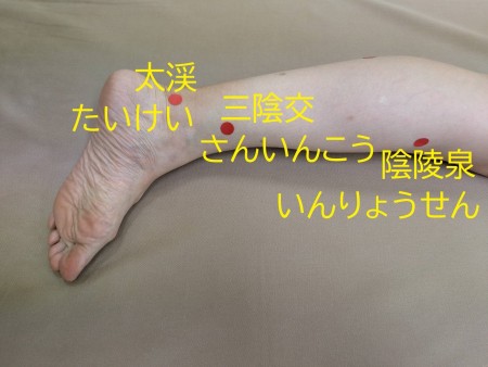 〇三陰交 :内くるぶしのいちばん高いところに小指をおき、指幅4本そろえて、人差し指があたっているところ