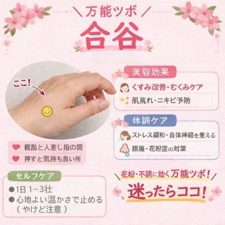 合谷(ごうこく)は「顔と上半身の不調に強いツボ」として、美容目的でもよく使われています。