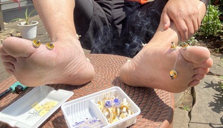 鍼灸の説明をした上、それぞれの気になる主訴をお聞きし、お試し施灸です。「こっちは熱くなりましたが、ここは全然熱くならないですね」「熱く感じないところは、体がお灸の熱を求めているところ、比較的悪いところと思ってください」「二つ目のお灸をしても良いですが三つ目は火傷するから二つまでにしておきましょう」など話をしながらお灸の会を楽しみました。