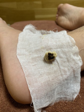 痛みがある程度ひいて少し動くようになったらお灸の出番です。こちらはサッカー練習中に内反捻挫を起こしてしまった方の治療。しっかりガーゼ灸を行いました。治療後は動けるようになったと喜んでおられました。