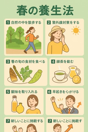 ・春の旬の食材を食べる:菜の花、たけのこ、アスパラなど、春の食材で栄養を補給します。