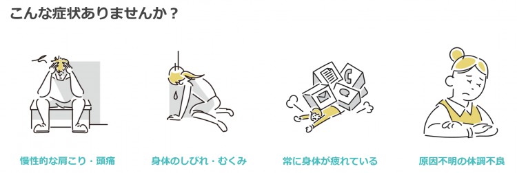 頭痛、めまい、頸肩こり、腰痛、不眠、手足の痺れ、膝の痛み、過度の倦怠感。