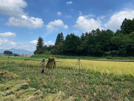稲穂を鎌でザクッと切り、束ねた稲を稲架(はさ)に掛ける…。