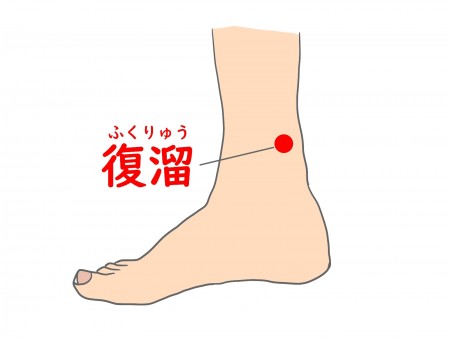 【復溜/ふくりゅう】内くるぶしとアキレス腱の間、指3本分上