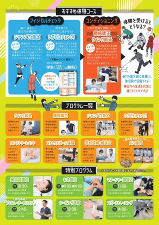 イベントでは、ケガの危険度を知るケガゼロチェックやスポーツの可能性を知るジャンプ力測定、クイック鍼灸・骨格矯正など様々なブースがあり、体験が盛りだくさん。