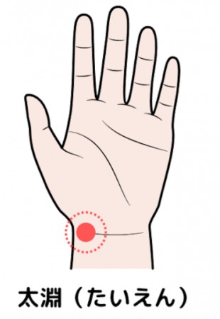 手のひら側の手首、親指の付け根にあるくぼみで、触ると脈を打っている部位になります。