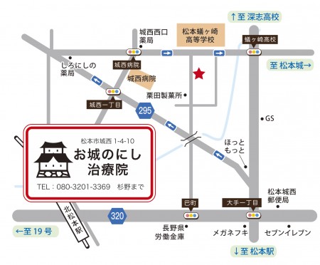 松本城の近く城西病院と蟻ヶ崎高校のすぐ近くに当治療院はございます。