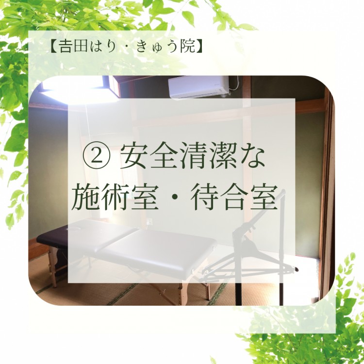 ②安全清潔な施術室・待合室法規に従い、十分な施術スペースと待合室、換気設備と照明等、