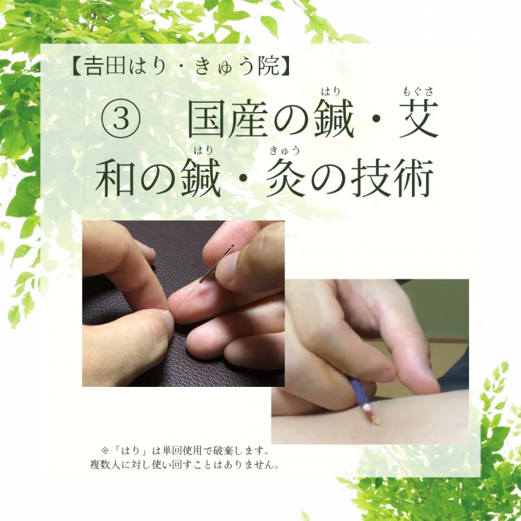 ③日本の鍼、日本のお灸品質の高い鍼と「せんねんきゅう」セネファさんの質の高いお灸を使用しています。
