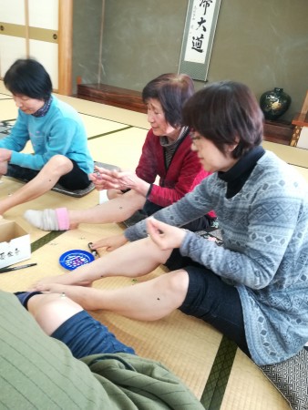 みなさんお灸は初めてだったので、まずは足三里や三陰交など基本的なツボから。簡単な取り方の目安をお伝えし、ツボの感触を確かめながら一つ一つ、ご自分でツボを取っていただきます。そしてお灸をのせます。
