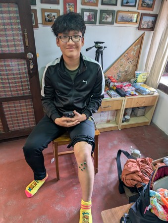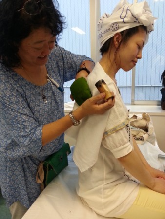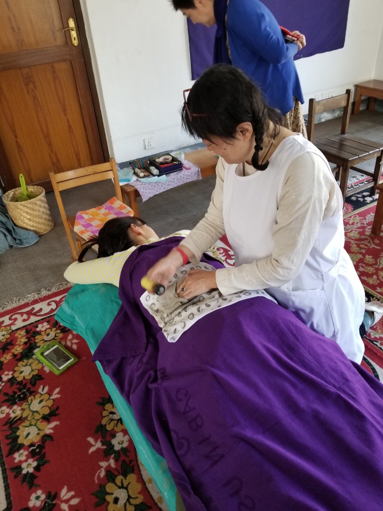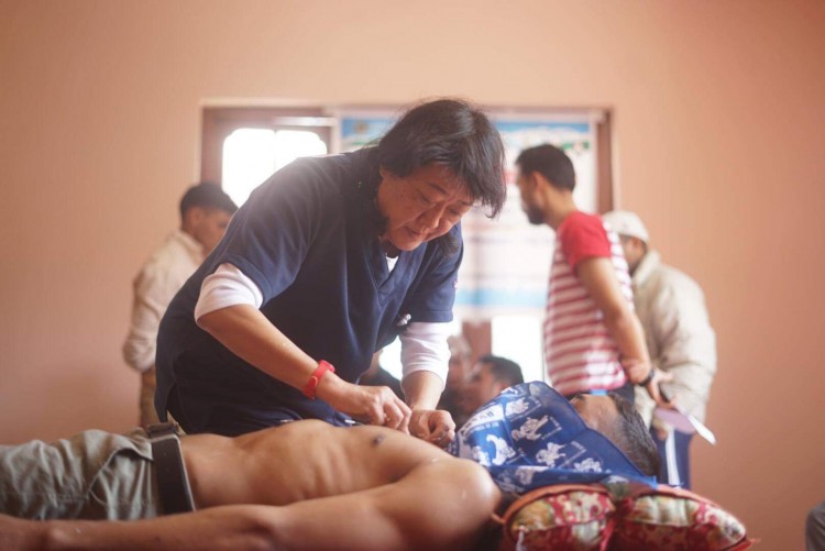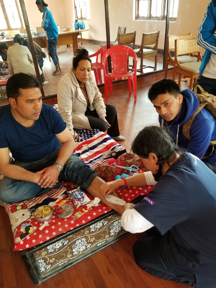 ネパール鍼灸ボランティア風景その2肩の骨折後の不調をお灸と鍼で改善しているところです