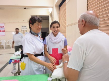 ネパール鍼灸ボランティア風景その3治療風景に興味深々の様子です。痛いのか痛くないの聞いている様子です。痛くないよと聞くと皆さん安心して治療を受けてくださいました。