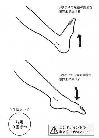 まずは、足首の曲げ伸ばし――血流をよくすることが、こむら返り対策の一丁目一番地となります。