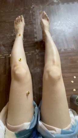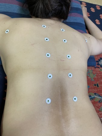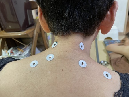 肩にチョンチョンとシールを貼ってこの上に米粒くらいのお灸を据えていきます‼️