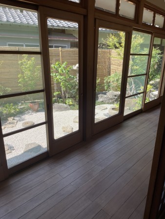 古民家の縁側でお庭をみながら