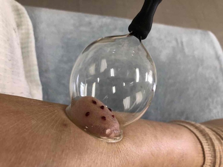 刺絡治療ノック式ボールペンに似た三稜鍼というハリで硬く凝った部分をねらいます カッピングを併用します