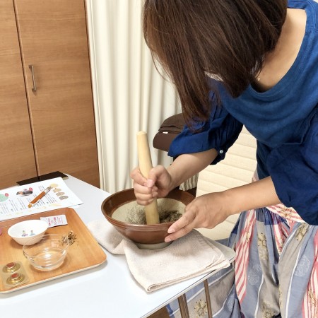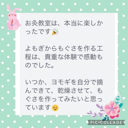 「お灸教室は、本当に楽しかったです。よもぎからもぐさを作る工程は、貴重な体験で感動ものでした。いつか、ヨモギを自分で摘んできて、乾燥させて、もぐさを作ってみてたいと思っています。」