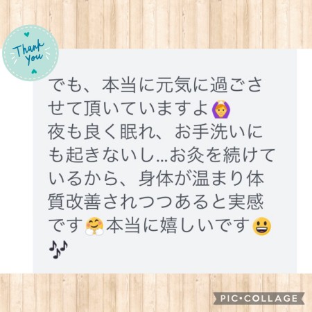 「本当に元気に過ごさせて頂いていますよ。夜も良く眠れ、お手洗いにも起きないし、お灸を続けているから、身体が温まり体質改善されつつあると実感です。本当に嬉しいです!」