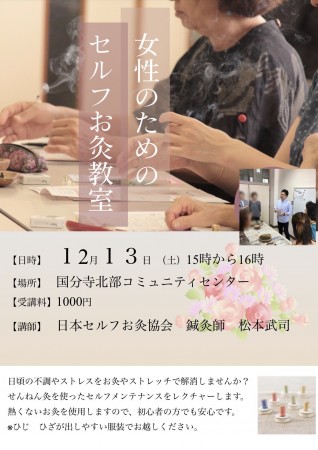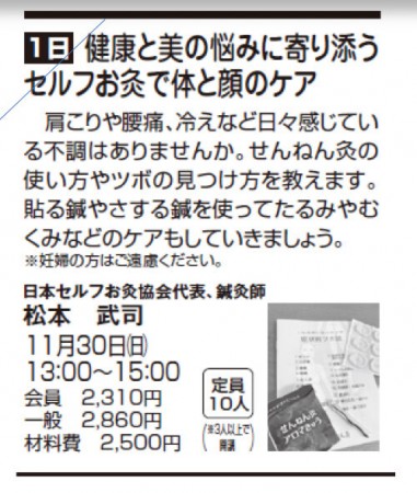 「自分の身体は自分で治そう!」をモットーに、中国新聞文化センター、岡山済生会カルチャー、高新文化教室、神戸新聞文化センター、香川県内のコミュニティセンターなどでセルフお灸講座を開催しています。