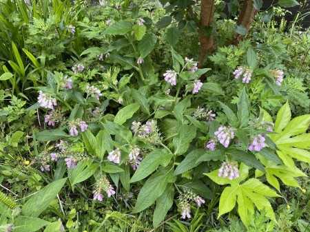 紫の花のコンフリー(画像②)、ベニシアさんおすすめの土の栄養分として苗を購入しましたが他の効能もあります。創傷の治癒を促進し、傷口を癒す助けとなります。炎症抑制:抗炎症作用があるため、皮膚の炎症を和らげます。軟部組織損傷:関節や筋肉の損傷を軽減すると言われています。