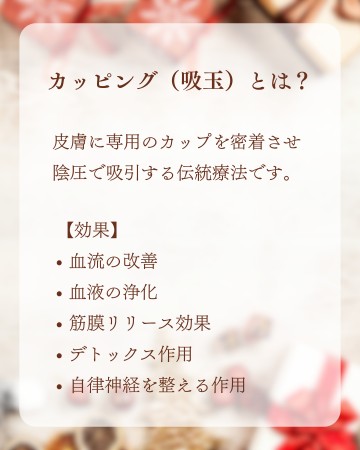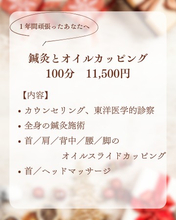 キャンペーンメニューは昨年大好評だった【鍼灸とオイルカッピング100分】