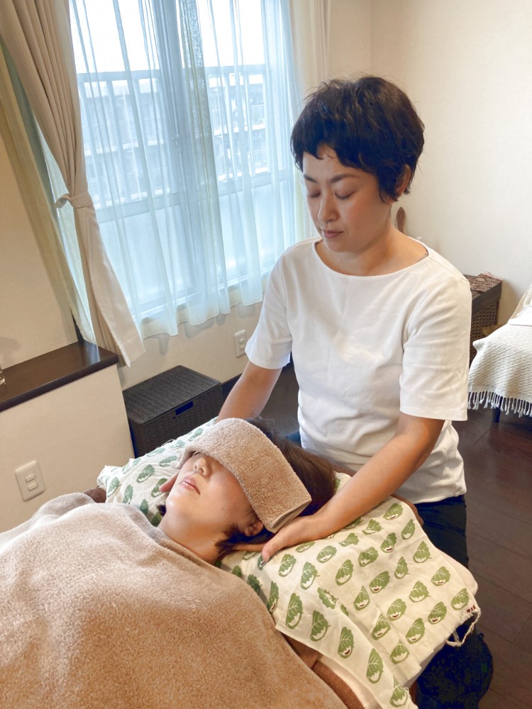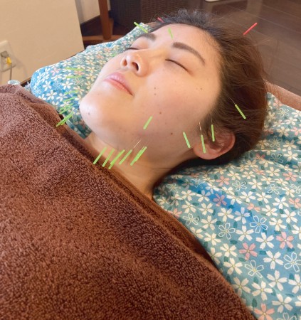 ・仰向けにて鍼灸施術、首/ヘッドマッサージ