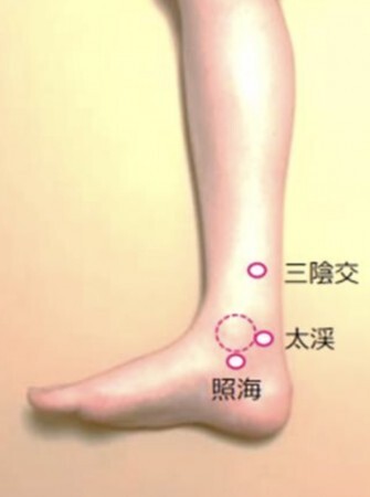 ツボの場所:内くるぶしのすぐ後ろの凹み、内くるぶしとアキレス腱の間。