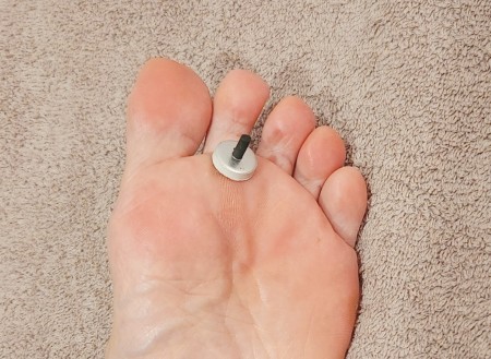 足の内側で、親指のぼこっとした関節から内くるぶしに向けて指3本分のところ。