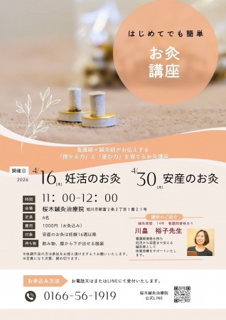 春は環境変化や気温差の影響で体調不良を感じやすい時期です。 少し立ち止まって、自分のカラダと向き合ってみませんか。 日々の不調を和らげるアナタだけのお灸を行います。